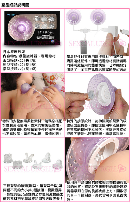 .商品內容:日本RENDS-R-1 U.F.O美乳迴旋電轉器  (吸盤旋轉器x1+接頭x6+專用線材x1) X1