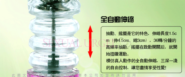 6種轉速,6段震頻,正反旋轉,帶來不同的高潮體驗!特製的人性化控制器,方便實用!棒身360度正反旋轉,與身體配合更完美!生活防水設計,讓快樂無拘無束!