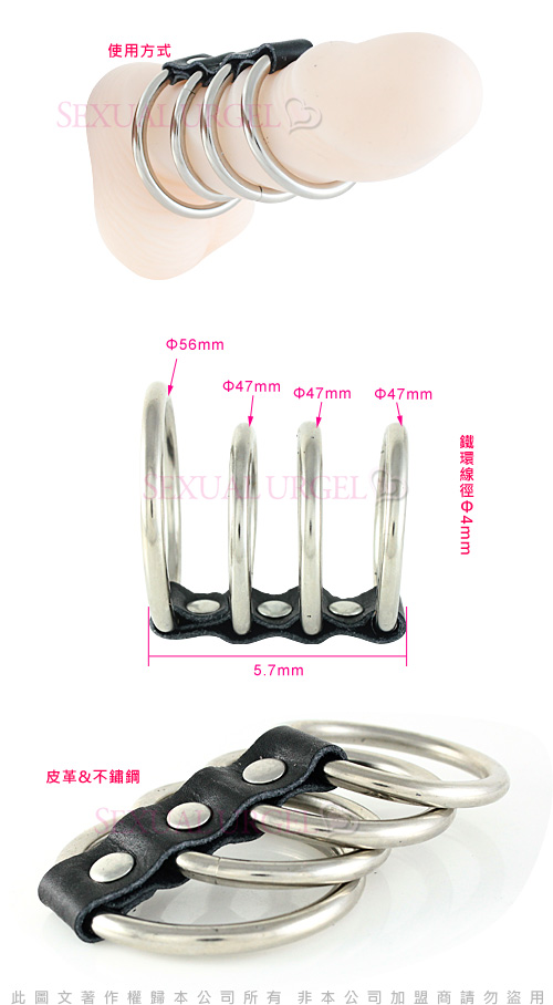 .本品由不銹鋼與皮革製作,由一大三小四隻陽具環組成,並以皮革扣帶相連