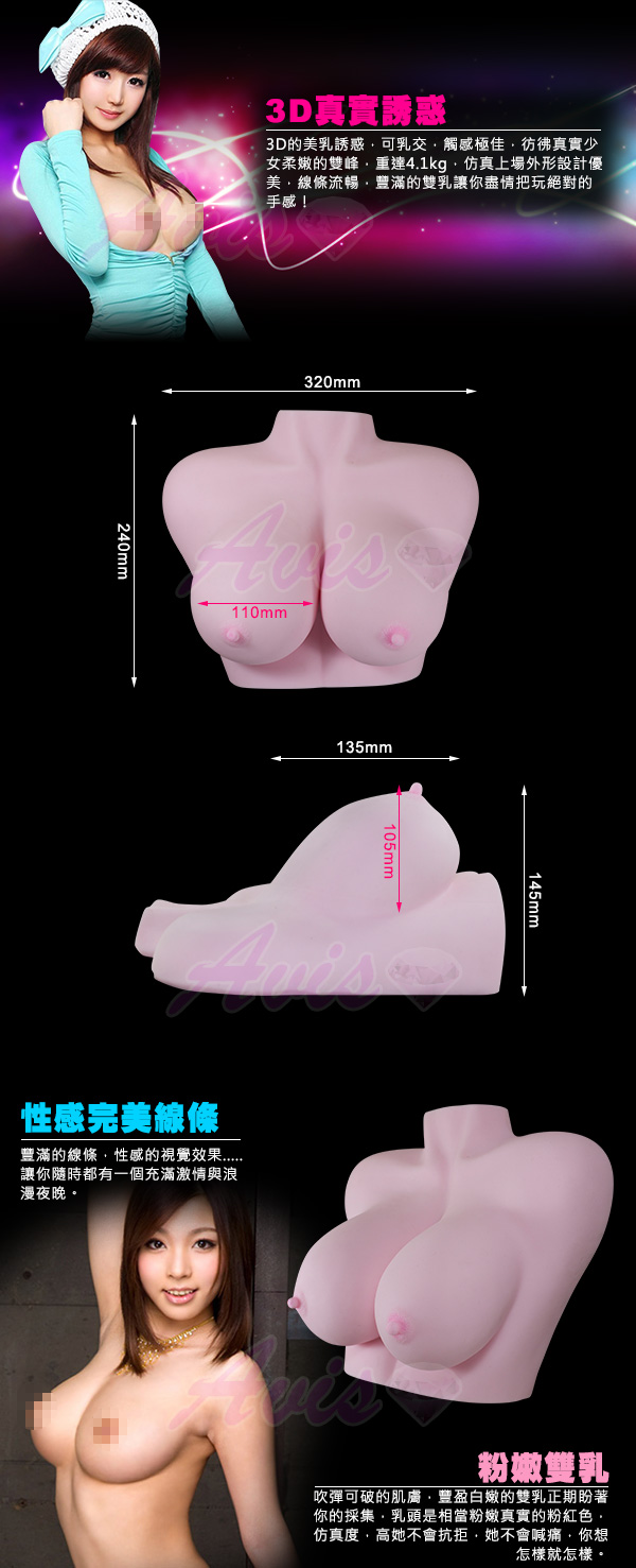 最高等仿真素材製成,幾乎與人體胸部無異觸感,乳交自慰器觸感級佳,重達4.1KG 如真人上場