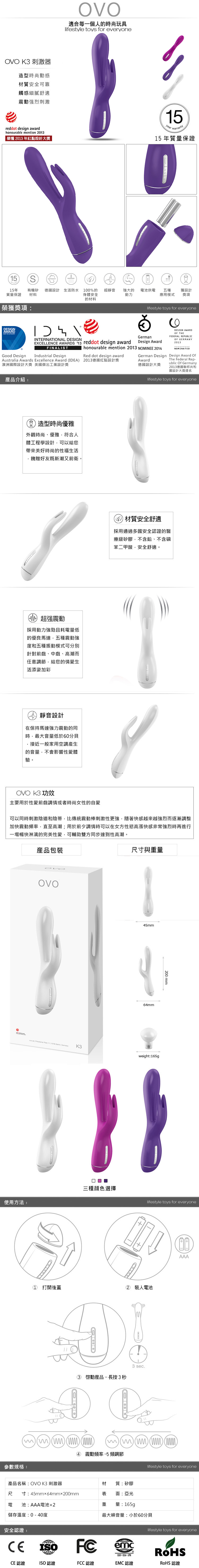 .主商品:德國OVO-K3 寶妮小兔 5段變頻 多功能 雙叉 震動按摩棒-紫色X1