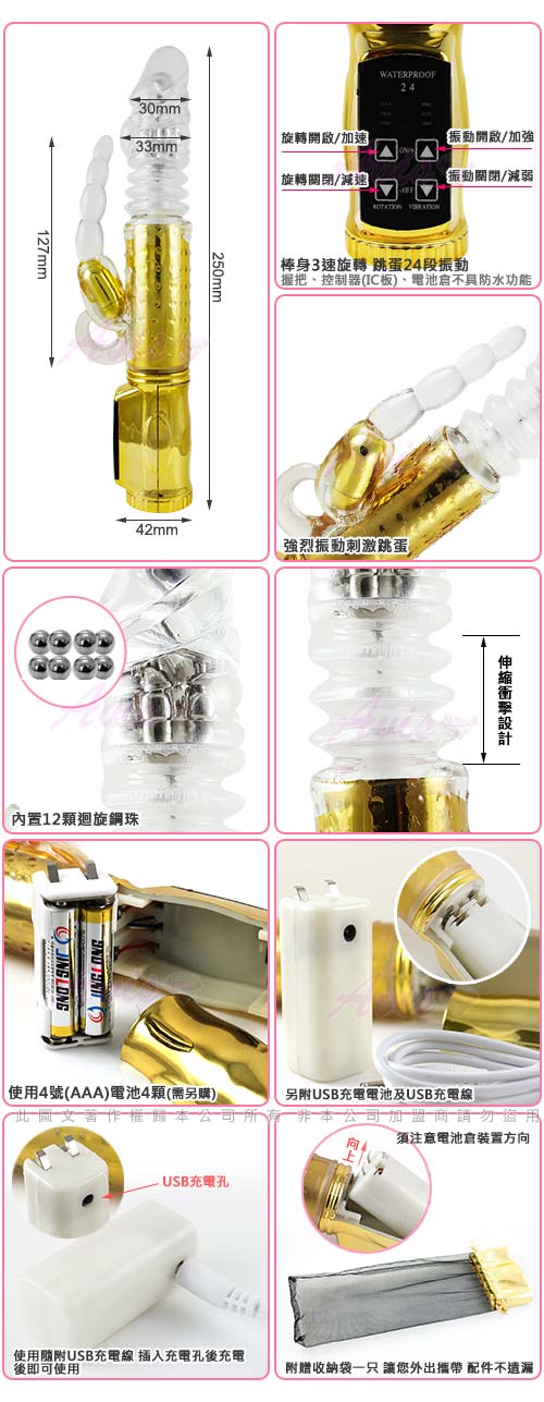 .商品名稱:獨角仙神話-72段 電池/USB 電鍍款(伸縮式)變頻滾珠G點按摩棒-金*1