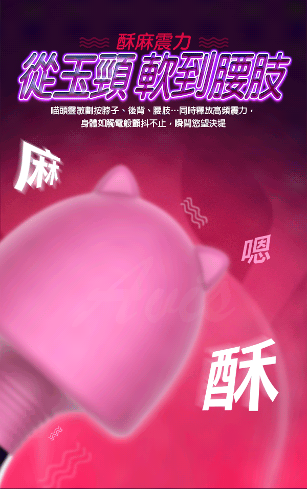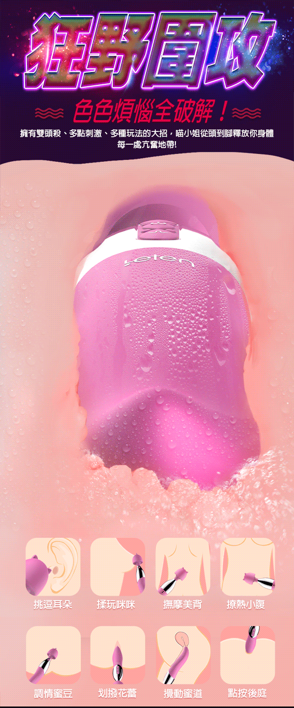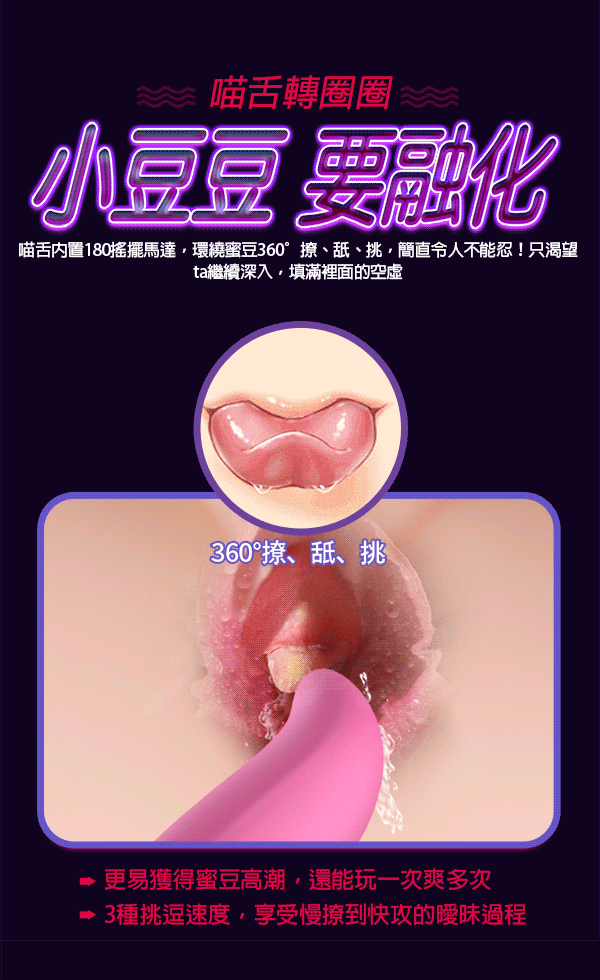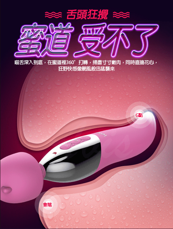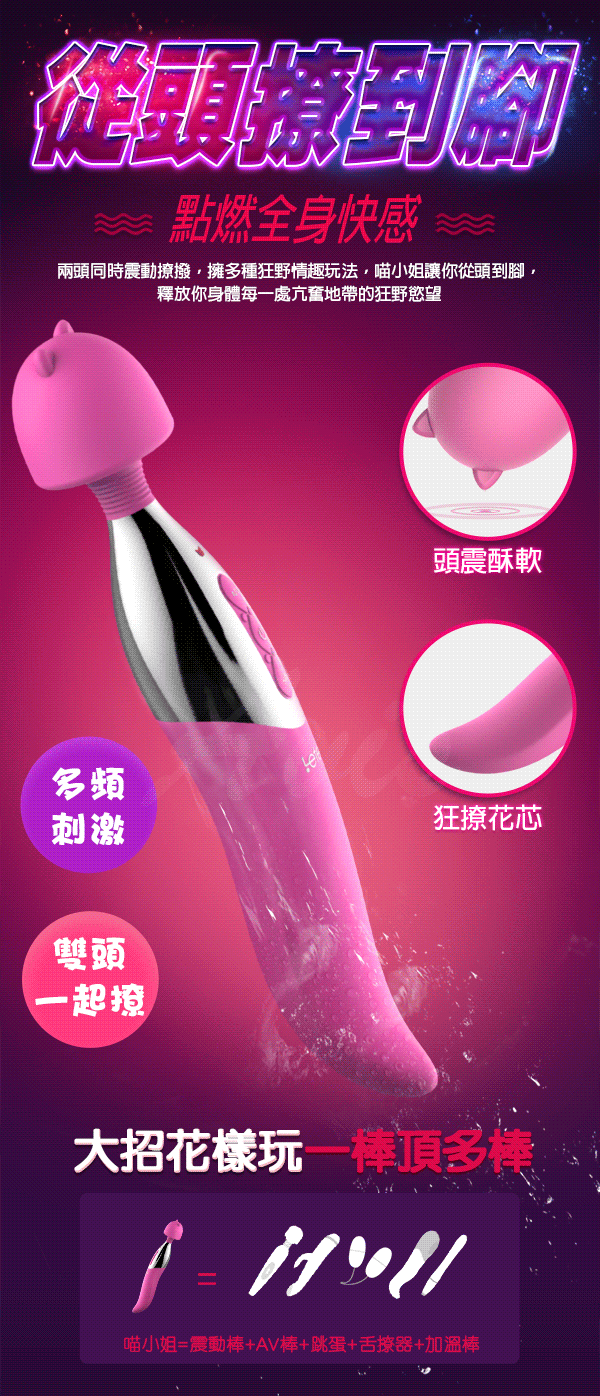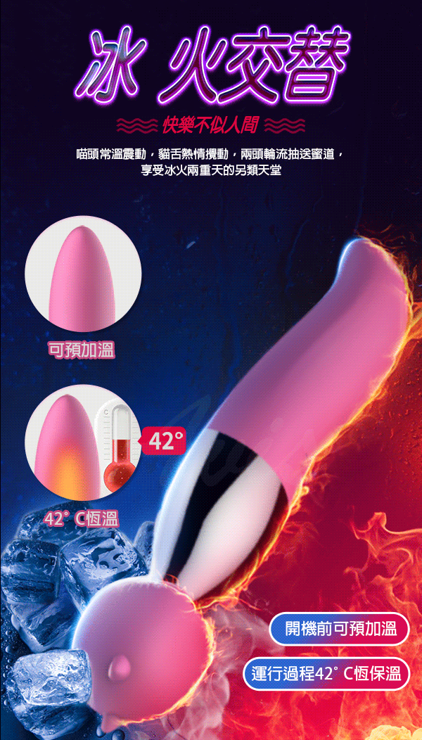 解決女人們對欲望無處發洩的困擾,喵小姐舌浪AV棒從頭到腳狂撩您,點燃您全身的快感一棒雙用兩頭皆可使用,多點刺激、多種玩法等您來釋放身體每一處亢奮地帶!特別設計冰火交替快感此款喵頭為常溫震動,喵舌為42度恆溫熱情攪動,使兩頭輪流抽送蜜道,享受冰火兩重天的另類天堂。此款為防水低噪設計讓您可盡情享受性愛帶來的美好時光喔