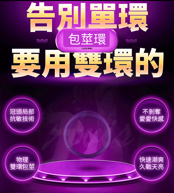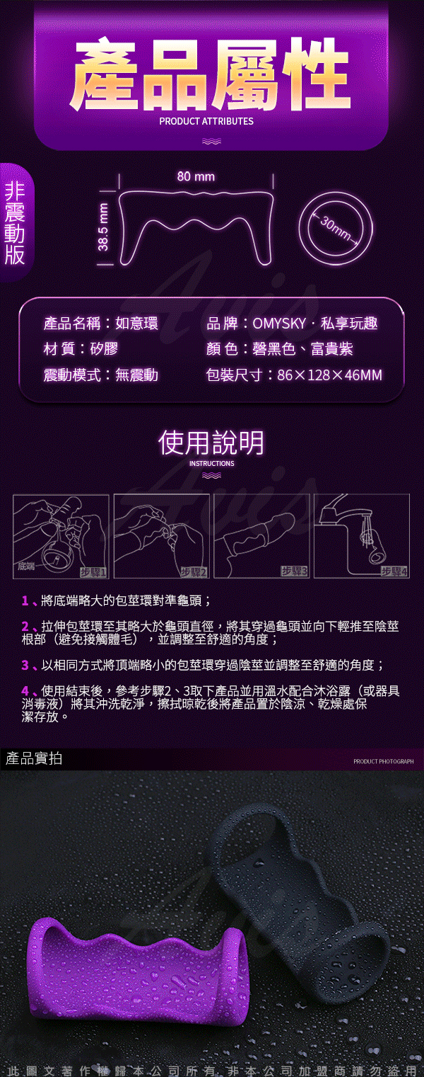 如意環設計保護冠狀溝敏感部位大大降低龜頭敏感度,莖體裸露不剝奪抽插時的摩擦快感,柔軟矽膠舒適耐用。可全身水洗讓您可以在沐浴時與伴侶自由享用,隨時滿足您的愛慾喔