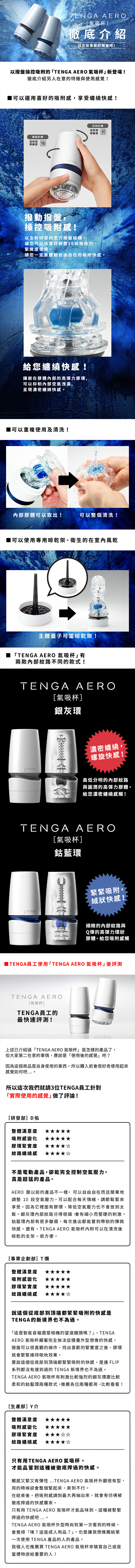 「TENGA AERO」氣吸杯,以新創開發的空氣動力技術,採撥盤式吸附操控,可輕鬆調節10段內部的吸附程度,內壁將自動旋轉並綿密包圍,產生強力的真空吮吸效果,不同快感由自己一手掌握!氣吸杯設計新穎趣味,杯體還能夠重複使用,款式共分為兩色(銀灰環、鈷藍環),擁有不同膠體及紋路構造;不同感官體驗可任君挑選。