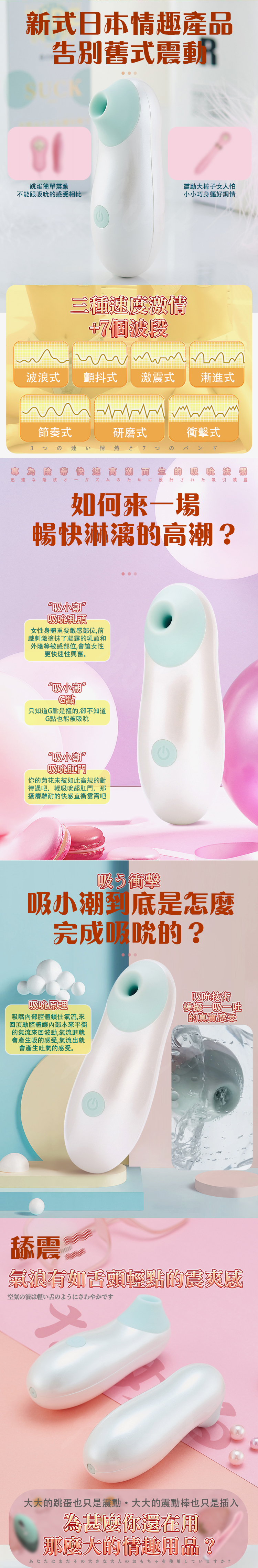吸小潮吮吸器,撩撥您身上所有敏感部位不管是耳垂、咪咪或是蜜豆都能輕鬆刺激到!!!擁有3速+7種波段吸吮每一種模式都能帶給您不同的感受喔~此款造型可愛小巧便攜,吸小潮將是您外出時的不二選擇高潮