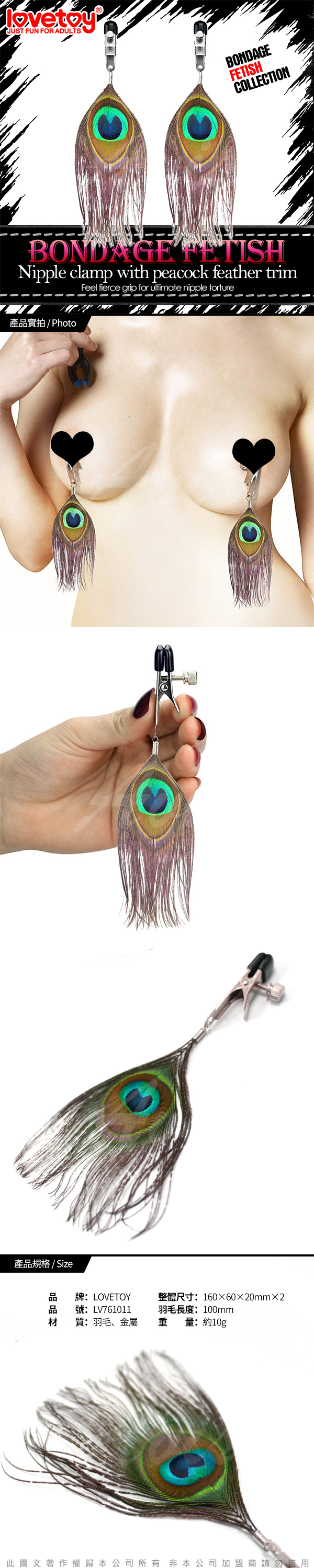 .商品內容:Lovetoy BONDAGE FETISH 虐戀系列-孔雀翎耳環式性感乳夾